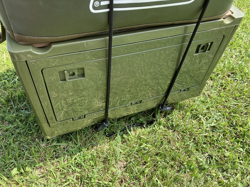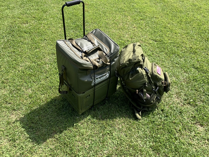 このコンテナの上に、2人1泊分の食材や飲料が入ったソフトクーラーバッグを載せました。