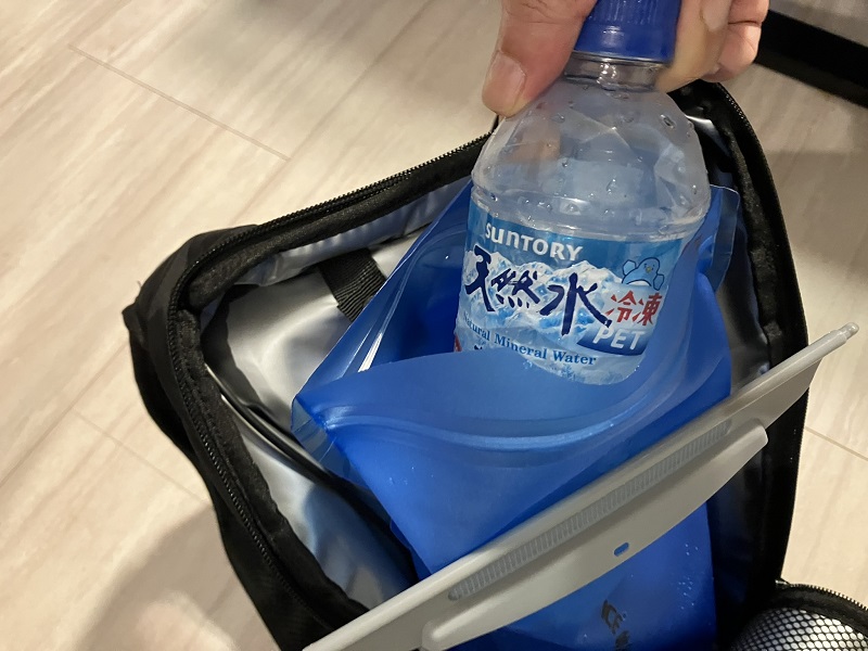 コンビニで売っている冷凍の水ペットボトル500mlが1本入ります。こちらは約1時間持続。