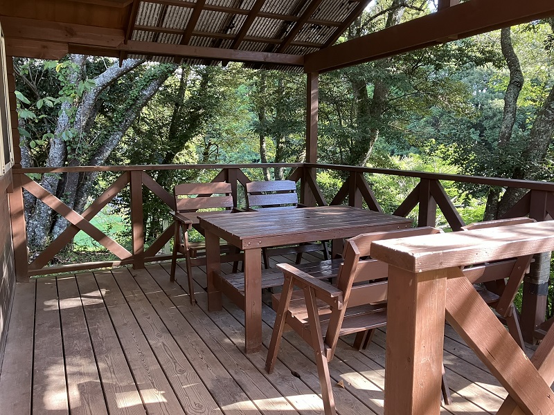 テーブルとチェアが置かれたウッドデッキもあります。