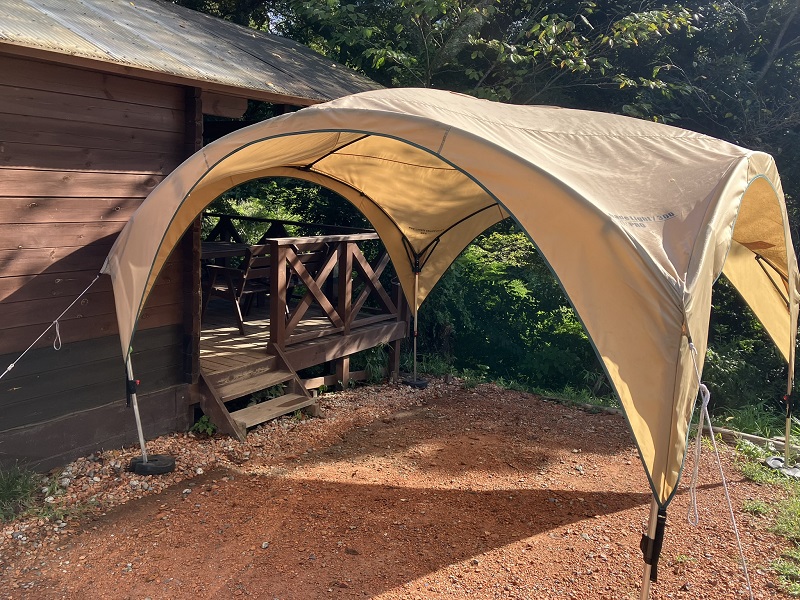 コールマンのパーティーシェードが常設された、BBQスペース付き4人用フォレストキャビンです。